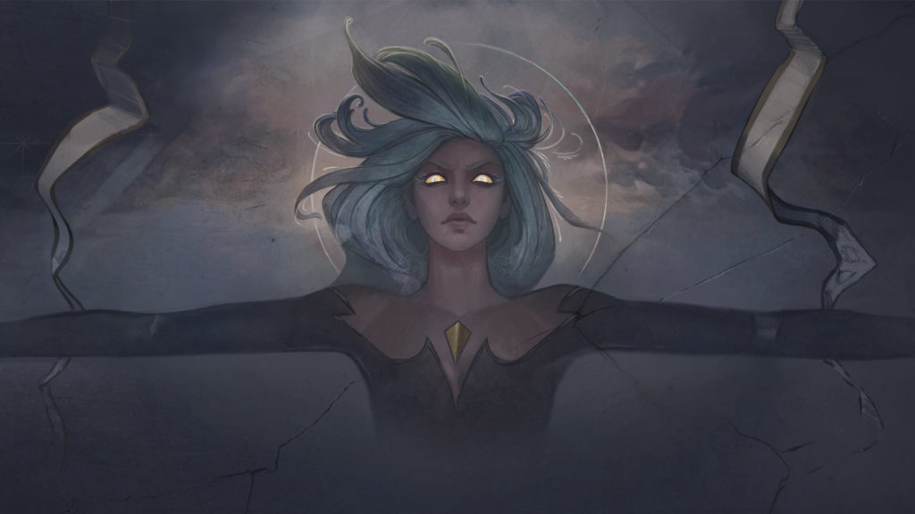 それを見たモルガナは彼女の眼前に飛びかかり、剣を構えた。定命の者たちの心に宿る闇を浄化するのなら、まずは自分自身の妹からだ。二人は天を駆けて戦い、互いに一歩も譲らぬ激しい応酬のすえ、眼下の建物は瓦礫と化した。
